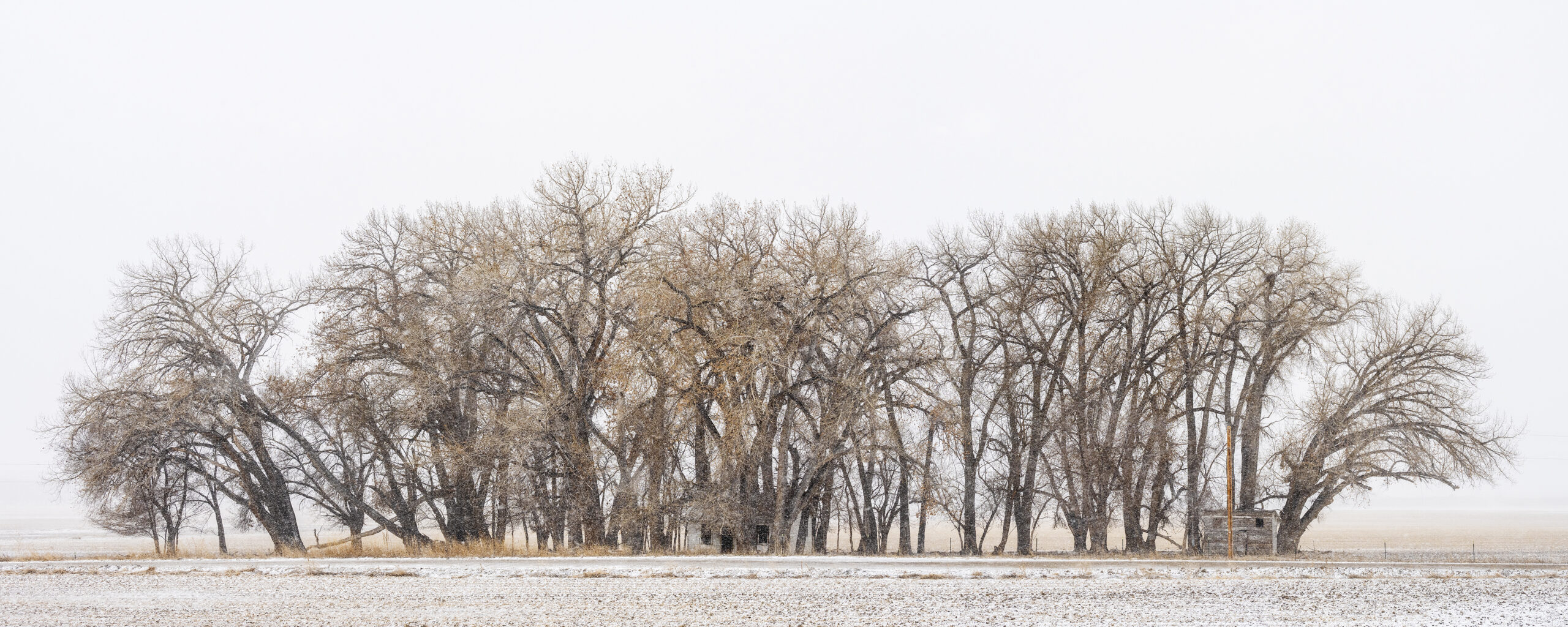 Above: An early snow covers the ground under a discrete stand of Cottonwood trees that tower over several abandoned buildings on Sidewinder Road off the Missouri Valley Road, north of Riverton, Wyoming.